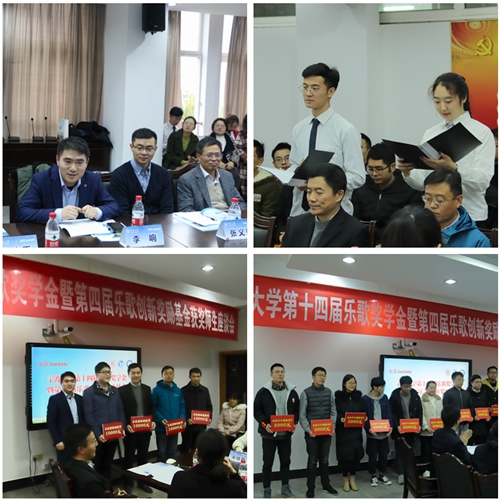 在学生人才培养、学生创新创业推动方面的工作业绩,同时也希望在座收到乐歌奖激励的同学能够将致力公益、汇报社会的理念传递,积极投入到学习活动和科研创新活动以及公益活动中去。