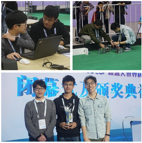 我校两支队伍在小组赛中就表现优异,都以小组第一的成绩提前出线。淘汰赛中,投石队遇到了此次比赛中最强劲的对手——上海交通大学SRC队。但我方参赛队员沉着冷静,机智应战,率先获得一分。对方及时请求暂停,更换策略,于上半场快结束时破门得分,双方持平。比赛也迅速升温。下半场时,我方在尝试多次跑位后,首先进球,夺得一分。对方也不甘示弱,连发两个角球先后夺得两分,实现反超,此时离比赛结束只剩15秒,我方及时请求暂停,更换策略,在终场哨响前成功破门,将比分扳平。此时,场外的观众热血沸腾,参赛队员的心弦也都紧绷着。进入加时赛后,双方仍旧不分上下,最终进入点球大战,我方最终以1球之差惜败。而另一支问路队则一路过关斩将,顺利杀入决赛。
