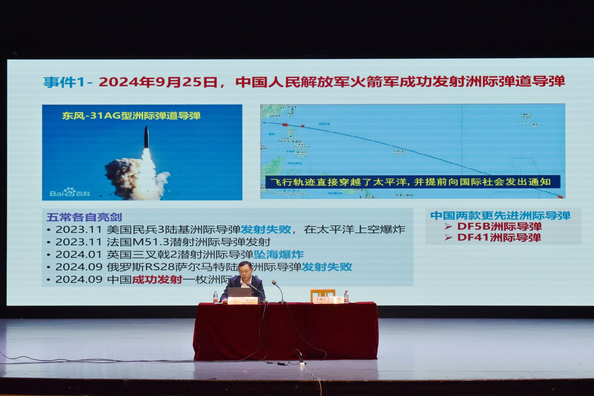 戴世勋以中国人民解放军火箭军成功发射洲际弹道导弹和欧盟对中国制造的电动汽车征收高达35%的附加税两个时政热点事件为切入点,从电车制造、载人航天工程、嫦娥工程、深海工程和量子科技等方面详细梳理了近十年来中国高科技的发展历程,阐述了中国高科技发展的现状。随后,针对以美国为首的西方国家对中国打压加剧态势,戴世勋指出,美国对华战略竞争逐步呈现全方位、多层次的特点,并结合事例、数据深入分析了美国对华实施的经贸战、金融战、打压中国高科技公司、司法战、舆论战等情况。同时,他通过进一步的解释揭晓了中国高科技出路的谜底——坚持自主创新和国际合作相结合、坚持开放发展与体制改革相结合、实施有效的科技创新扶持政策是当前应对美国对华全面科技遏制的主要策略。最后,戴世勋以“关心世界和国家大事、加强政治理论学习、只争朝夕,不负韶华”三点寄语作为结尾,表达了对广大学子的期许。