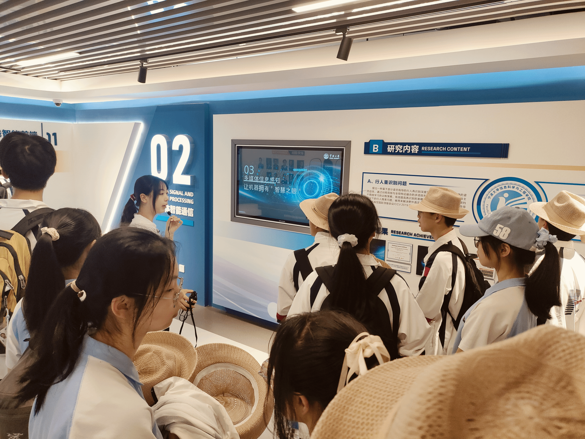 在“多媒体信息感知”展区,同学们了解了边缘计算在自动驾驶、图像增强与行人识别中的应用。通过演示与技术手册,展区展示了毫秒级避障响应、深度学习去雾重构高清画面,以及基于TransGait框架的行人重识别技术,即便在高遮挡环境下也能精准识别目标,生动展现了智能感知技术在现实场景中的实际价值。