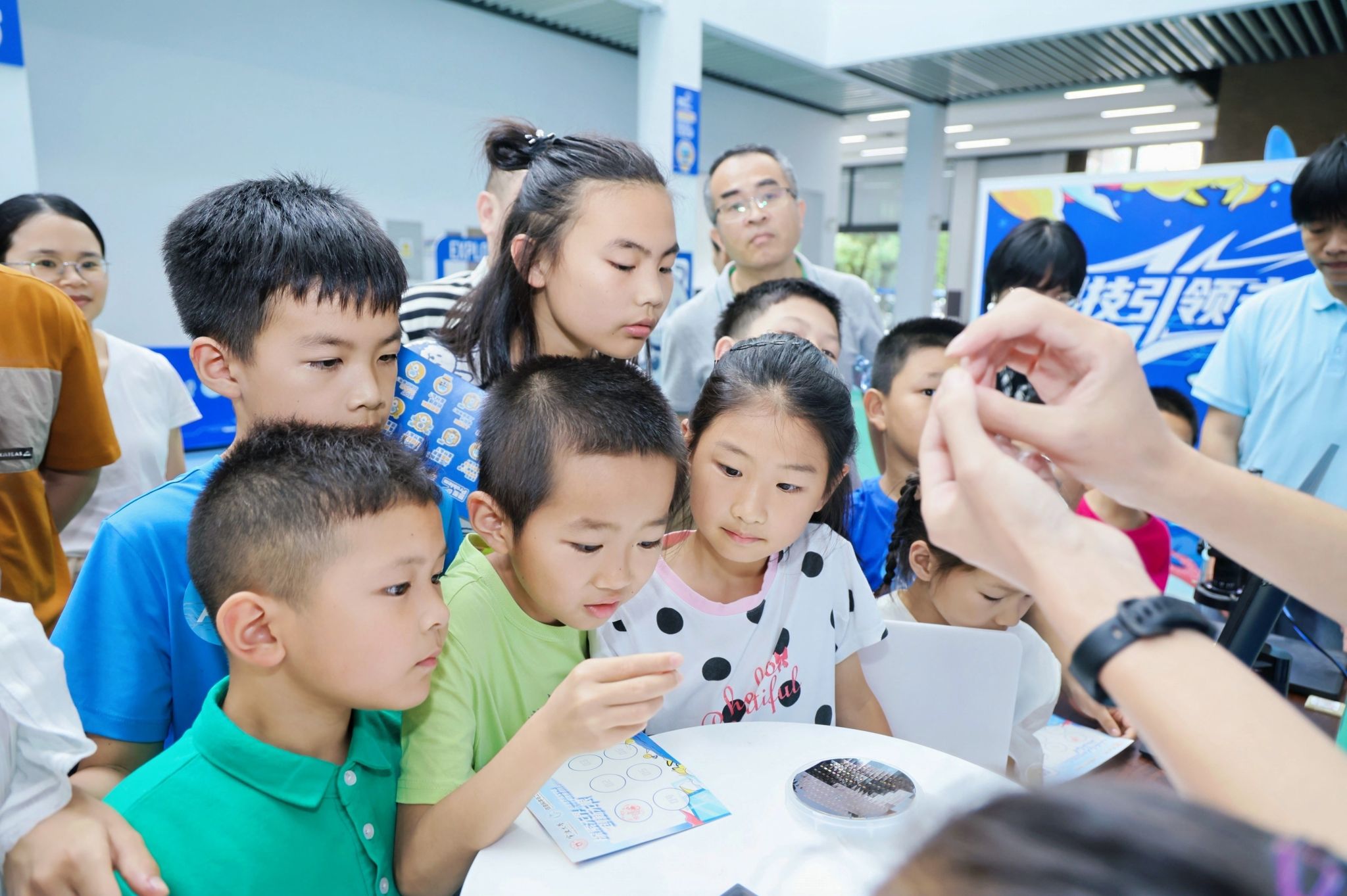 在展厅参观环节,孩子们在专业老师的带领下,走进“信息世界探索中心”,通过电子放大镜观察芯片内部结构,体验3D打印技术、AI垃圾分类和VR眼镜等前沿科技,初步领略了信息科学的魅力。