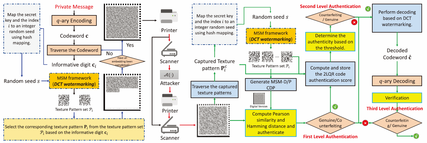 论文围绕复制敏感图形码(Copy-Sensitive Graphical Codes, CSGC)展开,提出一种将拷贝检测图案(Copy Detection Pattern, CDP)与双层二维码(Two-Level QR Code, 2LQR)统一到同一生成框架中的新方法——混合比特采样标记(Mixed-Bit Sampling Marking, MSM),在保持随机纹理抗复制能力的同时,支持私有信息携带与认证判别的统一设计。研究指出,CDP 与 2LQR 均可视为由“带信息的纹理模板”合成,MSM 在目标函数中兼顾白像素比例与空间随机性,并以可定制的相似性约束(如 DCT/皮尔逊相关)实现信息嵌入,通过两步采样算法生成既可构建 CDP、也可构建 2LQR 的纹理集合,从而实现“统一生成、按需调用”的文档认证新范式。