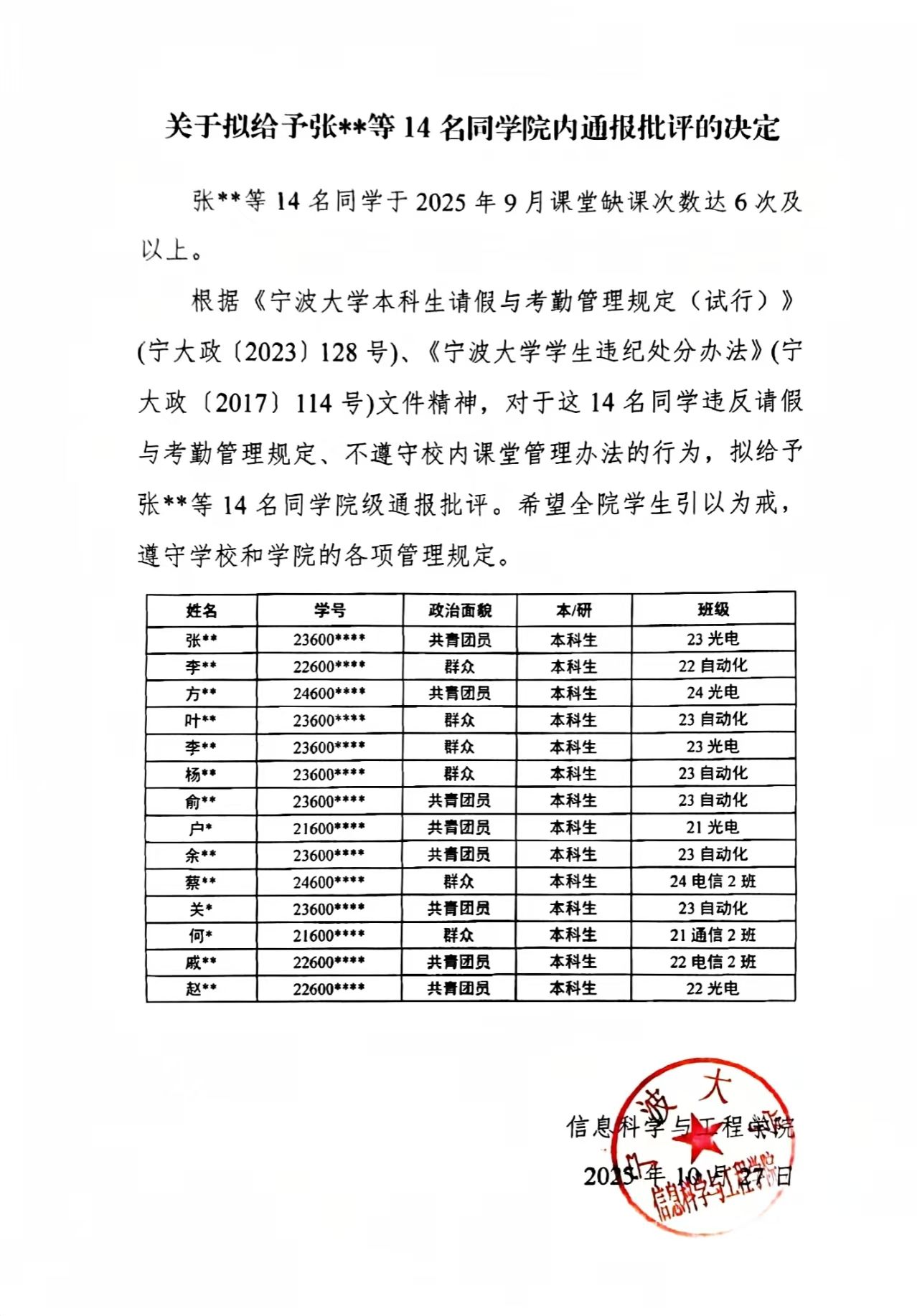 关于拟给予张**等14名同51黑料 内通报批评的决定