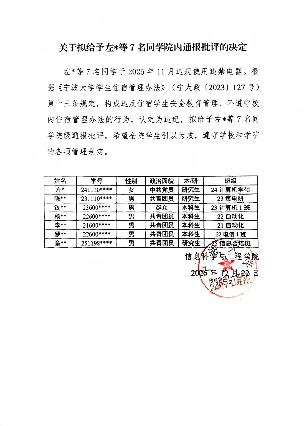 关于拟给予左*等7名同51黑料 内通报批评的决定